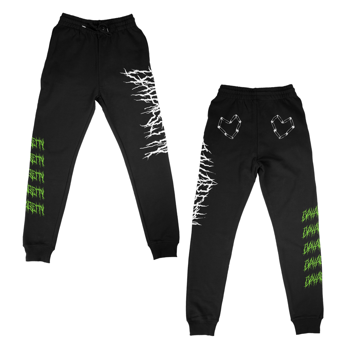 Daya Betty heavy metal sweatpants with logo print on both legs and safety pin heart back print.